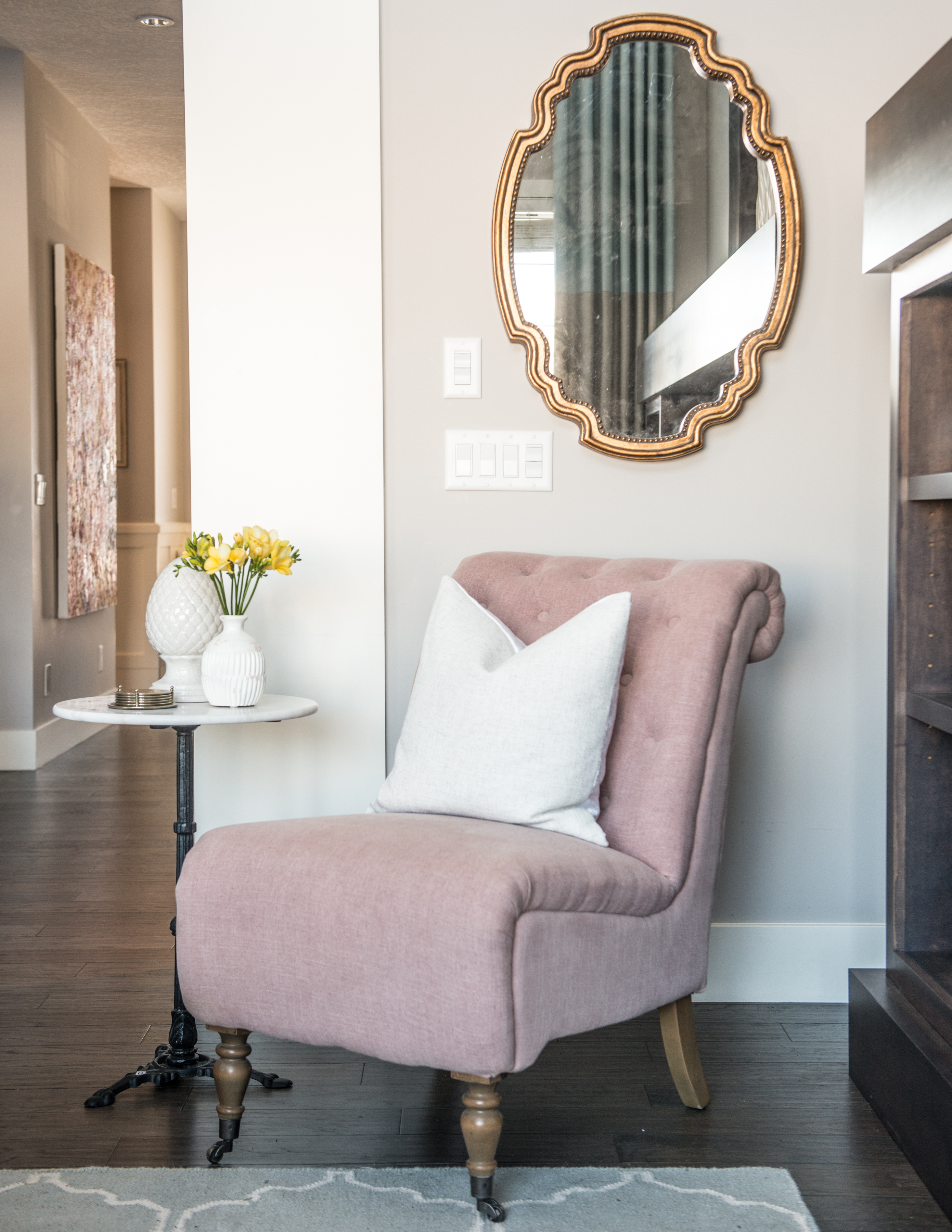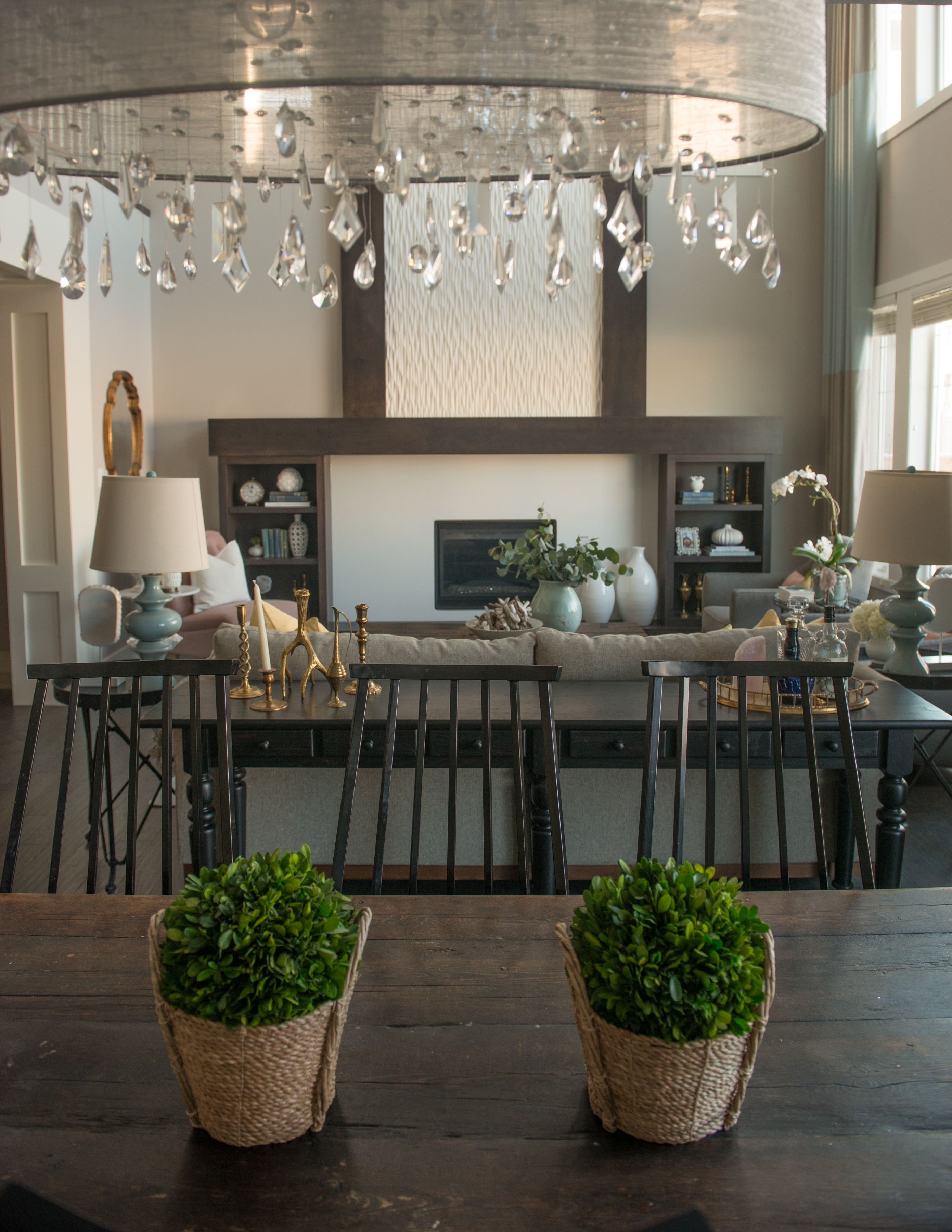 Velji found that the home’s basic elements were in place but needed a decor eye to create a story. “The entry was lackluster, so we added the zebra rug and the custom photo wall for some interest. Bespoke pillows for the dining room, accessorizing the mantle, adding in a few key pieces of furniture really brought the space some cohesion,” he says.