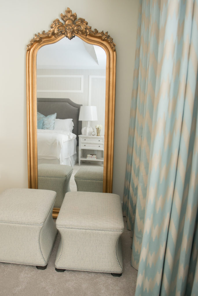 In the bedroom they added customized molding, bedding, powder blue drapery and wallpaper to the back wall to create a focal point. A vintage light fixture secures the room as a one-of-a-kind space.