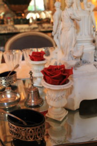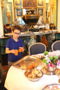 The table is a centerpiece within a dining room that displays collections in every possible nook. Museum-worthy drawings, paintings and important collections take you to a time where guests dressed in wigs and shoe buckles (one of my cousins collections). The walls are painted in regal mint green trimmed with gilded moldings. Above a Juliet balcony leads to a private room. Even the omission of industrial, air conditioned blasts confirm our presence in a Parisian space.