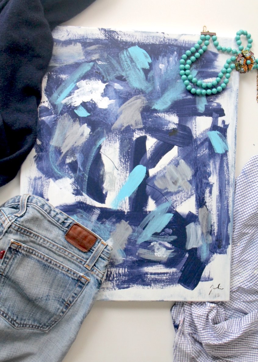 - In decor mix denim accessories with bold art.