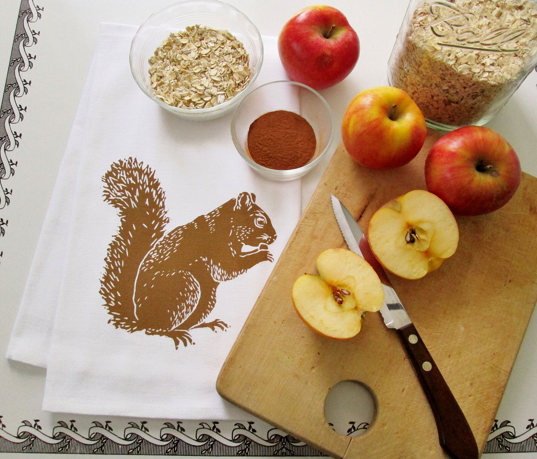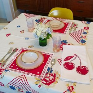 In the Michigan home of designer Lisa Price passed down traditions reign and are reimagined. Price is the ideal representative behind her whimsical, nostalgic textiles printed with squirrels, cherries or a charcoal grill, further emboldened by bright colors. Her organic pieces are all handmade in the classic wood cut technique, which add a time-honored cache of connecting to the artist—a rare skill in an age of fast fashion and Amazon Prime. Under the early tutelage of her “Grandma”, Price spent summers at her home where they would garden, feed wildlife, stock up on farmer’s market produce and “can up a storm.” She learned to sew and was inspired by her grandmother’s collection of vintage fabrics, which she would repurpose into clothing and aprons. Her creative instincts are atavistic, as her grandfather was a chef in the navy and wrote a cookbook, she owns multiple quilts made by her great grandma, along with a collection of antiques from her great aunt. “So the idea of a unique home, textiles, cooking, etc feels even more deep rooted,” says Price.