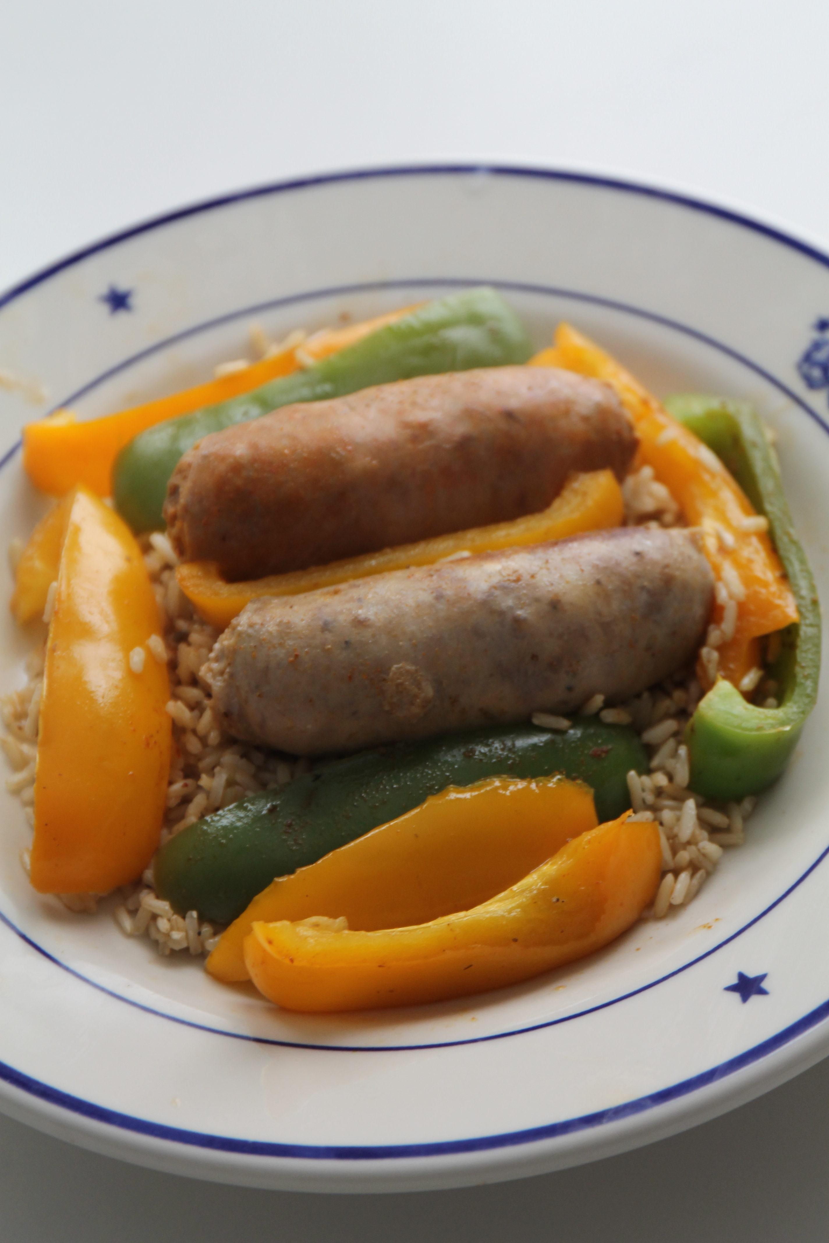 Serve sausages and peppers over rice.