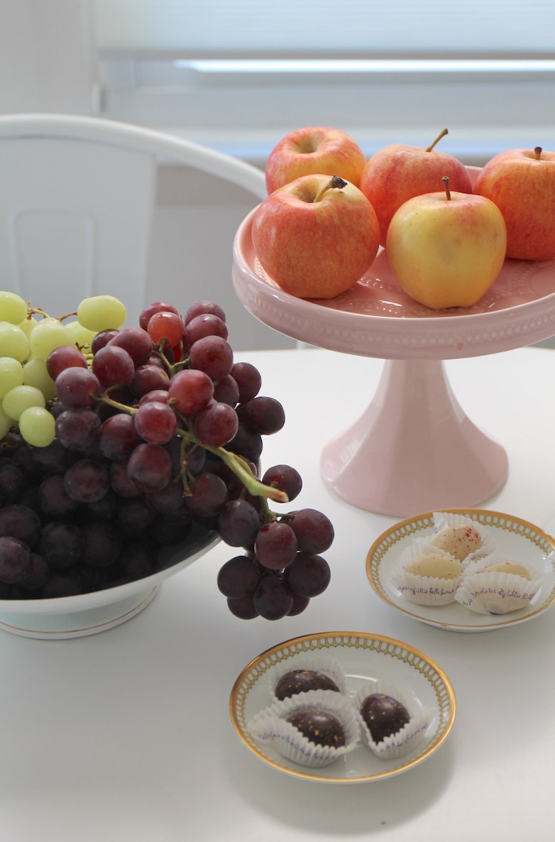 Flowers aren’t the only expected table arrangement, fruit and delicacies can aptly deliver a striking vignette. Chocolates and baked goods are delicious while providing beauty.