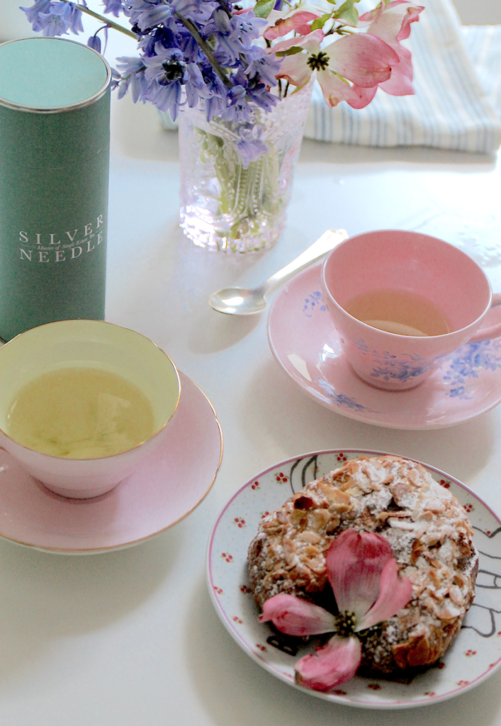 An imprecise display of tea ware, garden-picked flowers and pastries create a casual yet welcoming table setting.