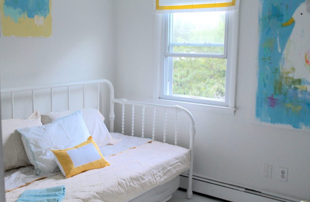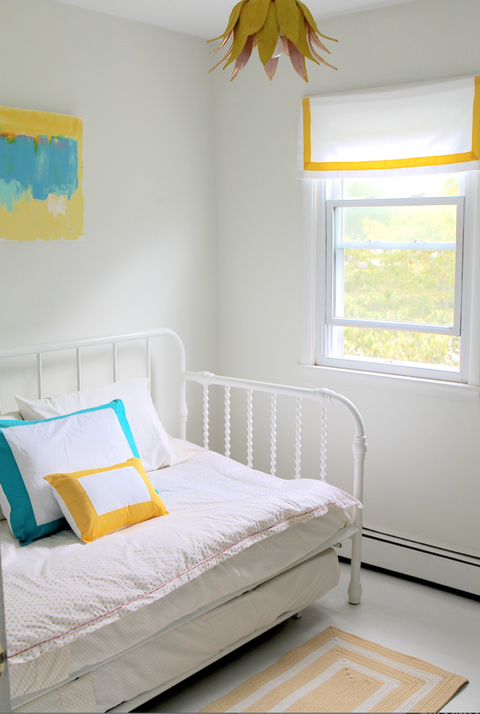 By removing the furnishings and painting the room white from floor to ceiling, creativity seeps in. Options open up. It begins with the home’s dominant color palette of turquoise and yellow, which set the inspirational tone. While such bold hues may be too brash for a main, communal room–guest rooms are meant to be experimental. Start with the basics, such as a sturdy trundle bed that has functional value by accommodating an additional guest without infringing on needed space.