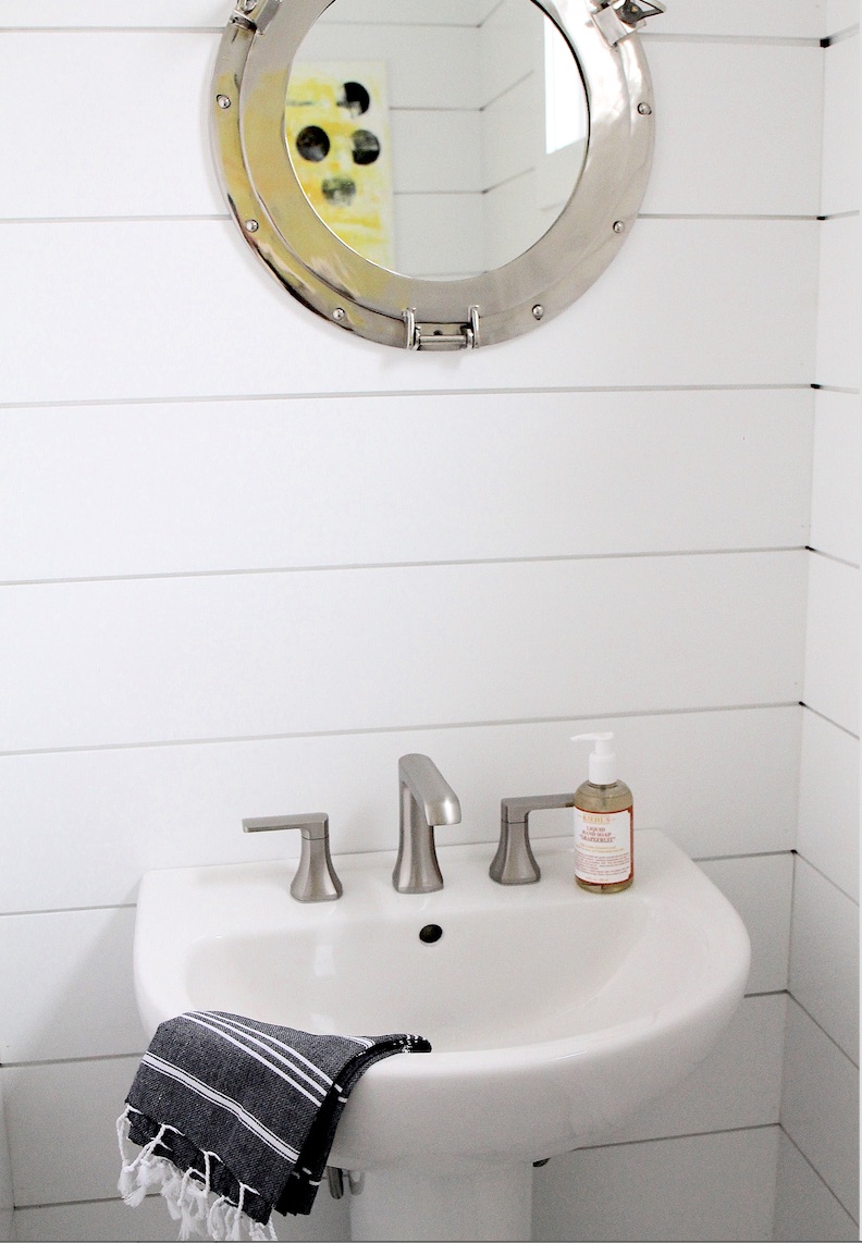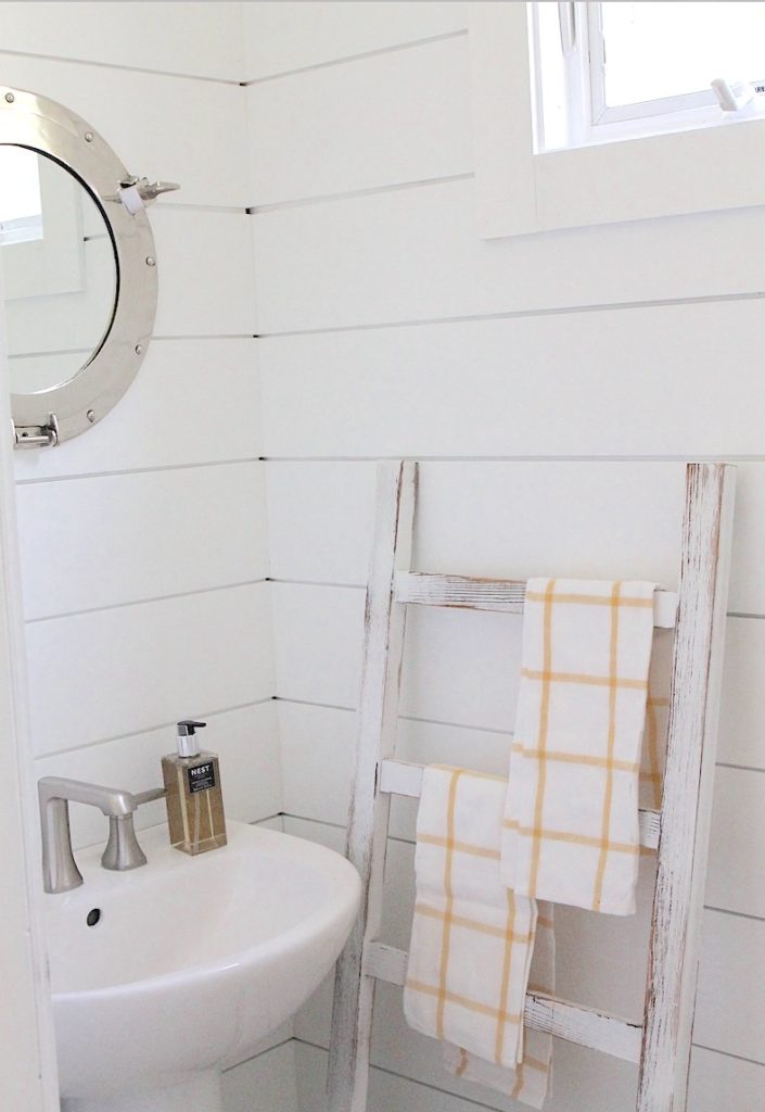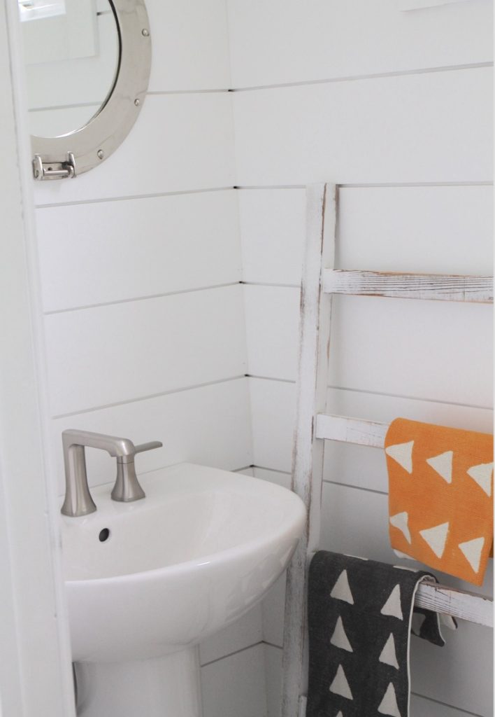 Once completed, we added a porthole mirror, hooks, paper dispenser, art and a ladder for towels that moonlights as a drying rack or handy place to stow linens.