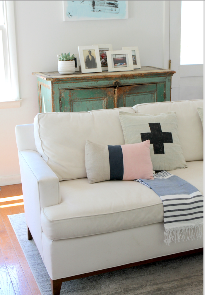 Pillows and throws provide both comfort and design, weaving in more interest to the sofa. Favorites include pillows from Etsy with high quality designs and patterns. Turkish towels are another favorite because of their colorful stripes.